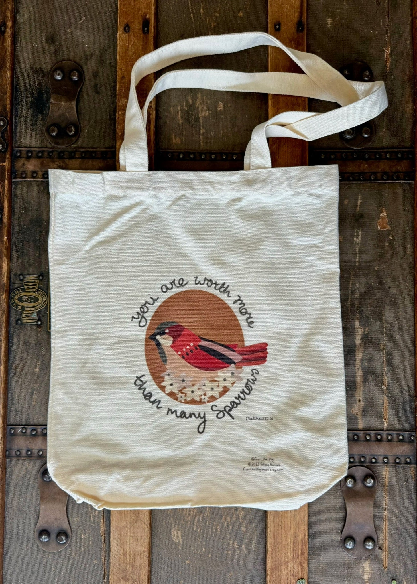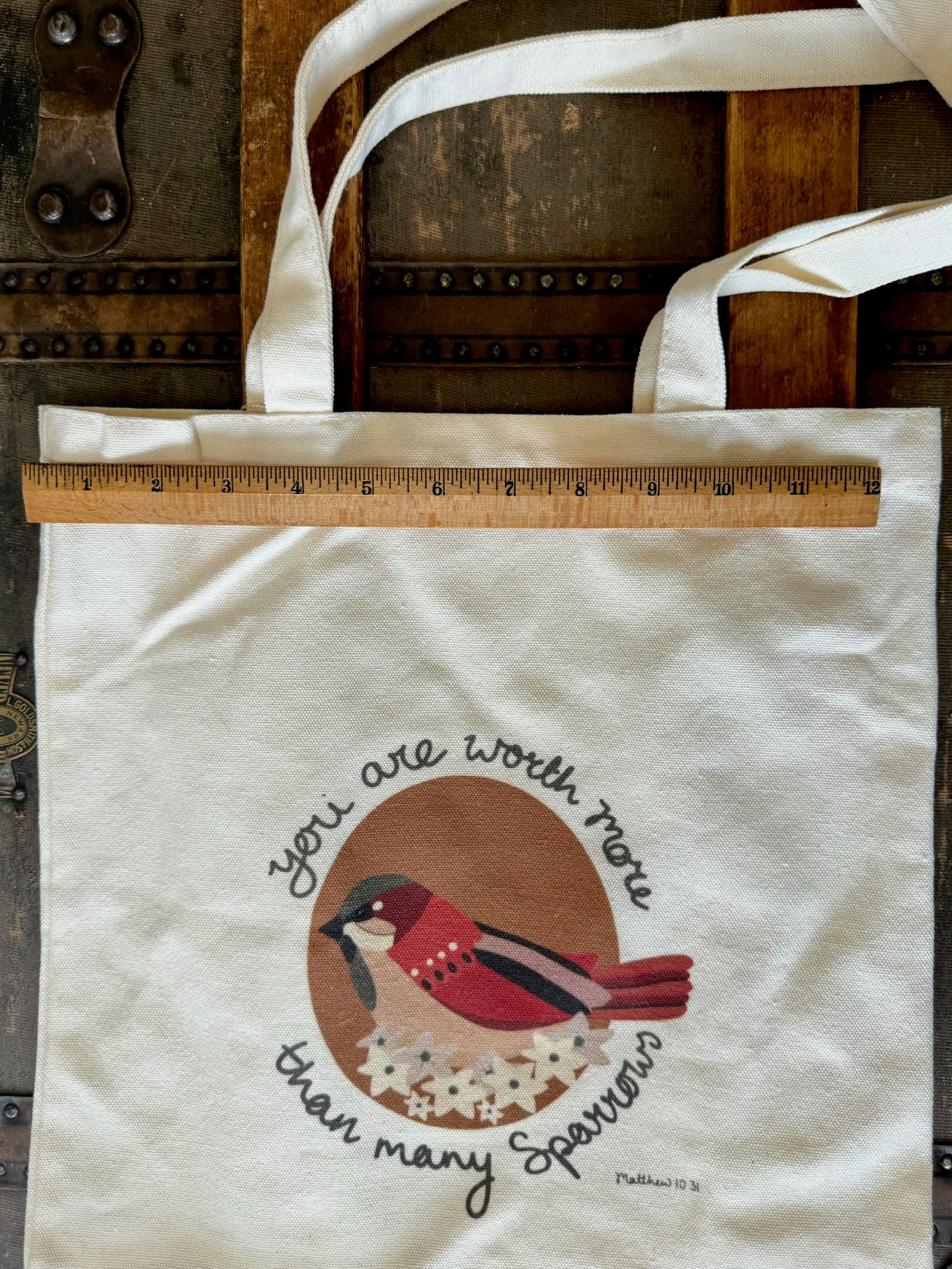 Stylish tote bag with sparrow print inspired by Matthew 10:31, makes a meaningful gift or practical daily use item. Durable, spacious, and well-crafted with quality materials.